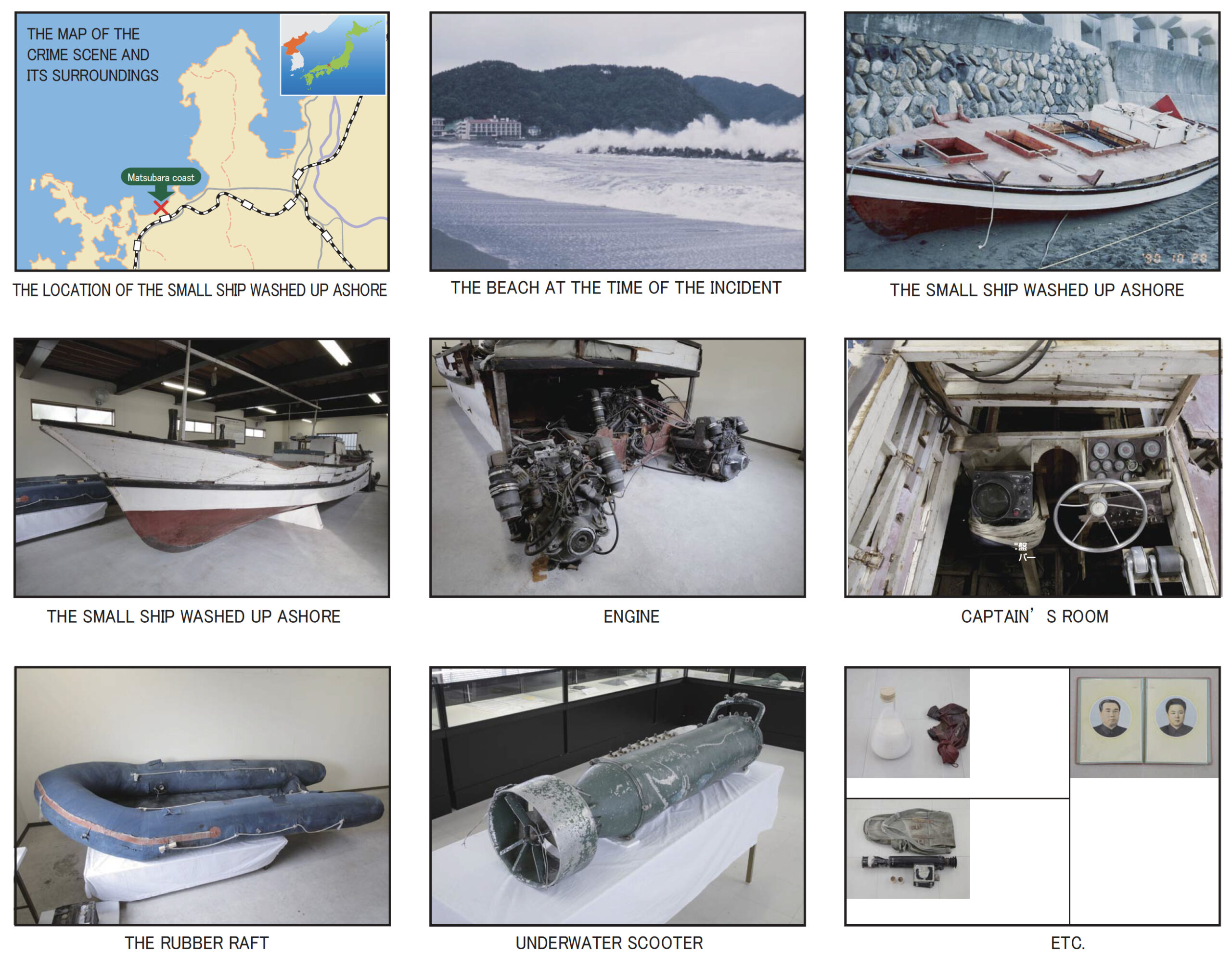 A small North Korean spy ship washed ashore on the early morning of October 28, 1990 (HEISEI 2) was discovered on the Matsubara Beach, Mihamacho in Fukui Prefecture. The Coast Guard found the tools used for spying activities and two dead bodies suspected as the crew members on the ship on board and around the vicinity. It is determined that North Korean spies have organizationally and deliberately planned an illegal entry into Japan. This small ship was hidden in the main North Korean spy ship. The Coast Guard suspects that the spies used it for going back and forth from the main ship to the shore.